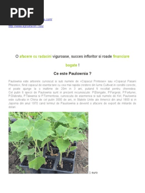 Paulownia este o specie de arbori originara din china foarte apreciata pentru lemnul de esenta tare dar si pentru aspectul sau decorativ. Paulownia poate dezvolta un trunchi masiv cu un lemn de culoare deschisa si foarte rezistent. Ideea e ca la mine cresc sunt bucurestean si am cumparat o proprietate la 50 km de capitala am pus sute acum am mii. Atunci cand puietul de paulownia a crescut in jur de 1m incepem sa eliminam primul si al doilea rand de frunze si tot asa la 1 5m 2m 3m.